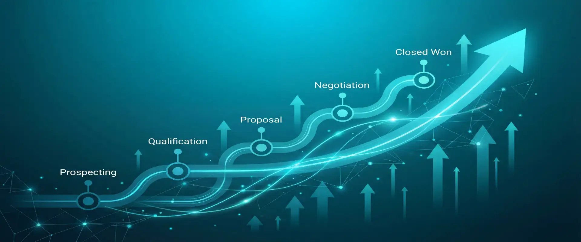 AI Prompt: Abstract sales/business visualization. Teal (#0891b2) to cyan (#06b6d4) gradient. Connected deal stages, pipeline flow, upward arrows representing growth. Clean, modern, professional. Suitable for white text overlay.
